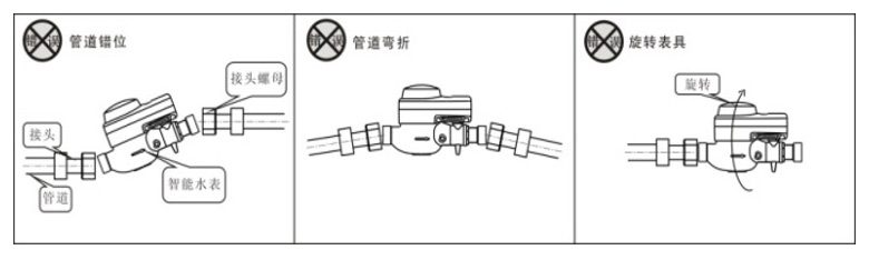 将(jiāng)表接頭套(tào)入接頭螺(luó)母後安裝(zhuāng)到管道上(shang),然後扭轉(zhuǎn)接頭螺♌母(mu)将水表安(an)裝到管道(dào)上,保持水(shuǐ)表讀數度(dù)盤水平向(xiàng)上,水表與(yǔ)管道連接(jie)時不應受(shòu)過大的折(she)彎力✔️,以免(miǎn)損壞水表(biao)接口斷裂(liè)。禁止出現(xian)如下圖所(suǒ)示的安裝(zhuāng)方式: